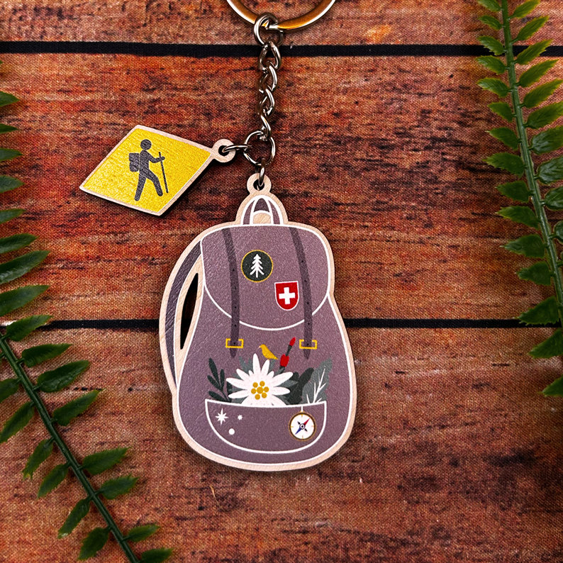 Mit diesem kleinen Rucksack-Schlüsselanhänger mit Wanderschild-Anhänger haben Sie die Magie einer Wanderung in den Schweizer Alpen immer dabei. Der Schlüsselanhänger ist UV-gedruckt auf 4 mm starkem, nachhaltig gewonnenem MDF mit Ahornfurnier. Das perfekte Schweizer Geschenk und Souvenir!