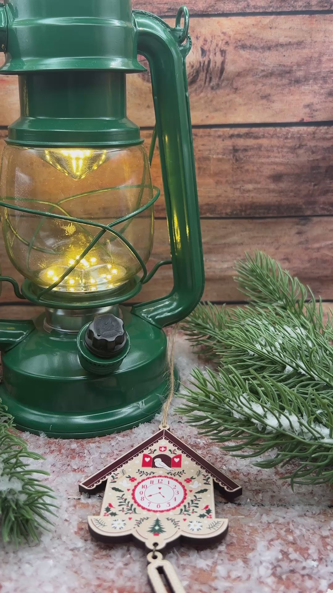 Festive decoration featuring an illustration of a winter cuckoo clock.